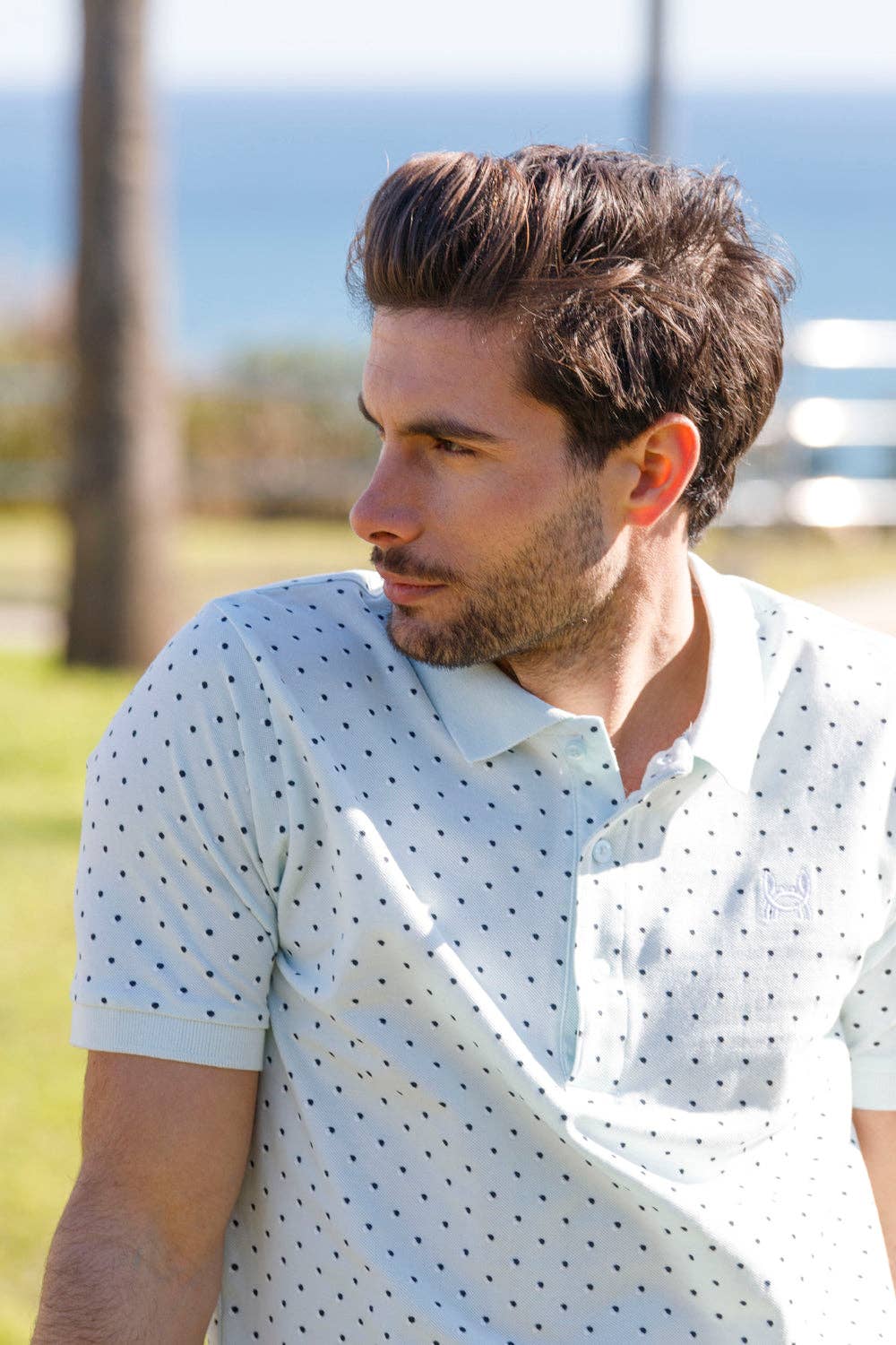 A fresh, understated hue for the modern wardrobe. Crafted from 100% cotton, the Venezuela Polo in coastal mint offers breathable comfort and effortless sophistication. Its subtle dotted texture and tailored fit make it versatile for casual days or warm evenings out. Model is 6'1" and wears a size M.